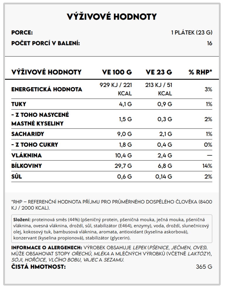 Nízký obsah sacharidů a vysoký obsah vlákniny – podporuje trávení a zajišťuje dlouhotrvající pocit sytosti.